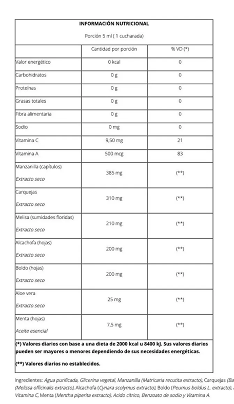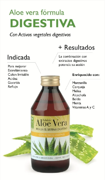 La combinación de jugo natural de Aloe Vera con activos vegetales, minerales y aminoácidos naturales actúa como un excelente tónico digestivo por su contenido en minerales, vitaminas y aminoácidos que promueven un estado saludable para tu organismo. Actúa eliminando las toxinas y aumentando las defensas. Su fórmula con Aloe Vera, manzanilla, menta, carqueja, melisa, boldo y alcachofa actúa como coadyuvante en casos de inflamación del tracto gastrointestinal, es gran depurativo general y colagogo. Facilita la expulsión de bilis retenida en la vesícula.