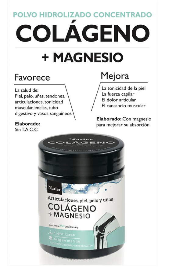 El colágeno es el componente básico de cartílagos, discos intervertebrales, ligamentos, tendones, huesos, la piel, cuero cabelludo, encías, paredes de los vasos sanguíneos y córnea ocular. El aporte nutricional de fibras de colágeno proporcionan resistencia y capacidad de tracción y compresión a ligamentos, tendones y músculos; refuerzan las paredes de los vasos sanguíneos y linfáticos; regeneran las encías; fortalecen el tejido epitelial y ayudan a aumentar la densidad ósea. A los 25 años comienza a disminuir la capacidad de nuestro cuerpo en regenerarlo y a partir de los 40 su síntesis se reduce un 1% cada año. Por lo tanto, a los 70 años se ha perdido un 30%. El envejecimiento no destruye el colágeno, sino que incide en una menor producción y en el endurecimiento de las fibras. Esta combinación enriquecida con magnesio mejora su síntesis proteica y su funcionamiento osteomuscular.