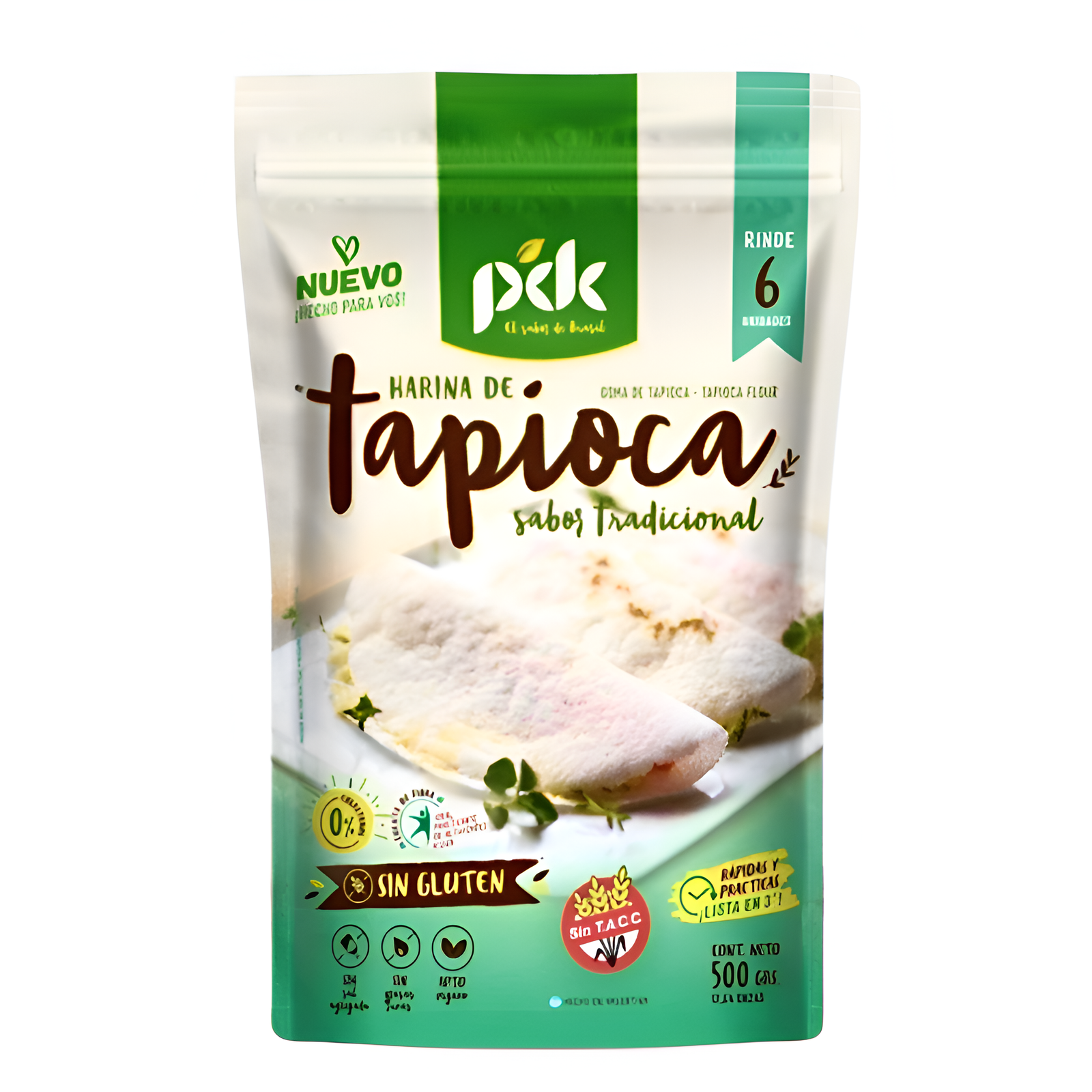 Harina de tapioca sabor tradicional sin gluten SIN TACC., 0 % colesterol, excelente fuente de fibra. Es ideal para preparar rapiditas o tapas de tapioca y rellenarlas tanto en opciones dulces como saladas.