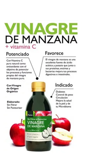 El vinagre de manzana se puede considerar un superalimento con múltiples cualidades. Es producto de la fermentación acética de la mezcla de azúcar y agua. Primero las levaduras transforman los azúcares en alcohol y luego las bacterias Mycoderma aceti o bacterias acéticas transforman el alcohol en ácido acético, lo que da lugar a su olor y sabor típicos. Contiene cantidades moderadas de pectina y abundante potasio. Sus oligoelementos y minerales fortalecen el sistema inmunitario, ayudan contra los dolores de cabeza y el asma, fortalecen la piel, el cabello, las uñas, y apoyan el tratamiento de la diabetes. Además, produce un efecto positivo sobre los niveles de colesterol y lípidos en sangre, protege contra la presión arterial alta y estimula la digestión. En menor cantidad, aporta vitaminas B1, B2 y B6, biotina, ácido fólico, niacina, ácido pantoténico, fósforo, calcio y magnesio.