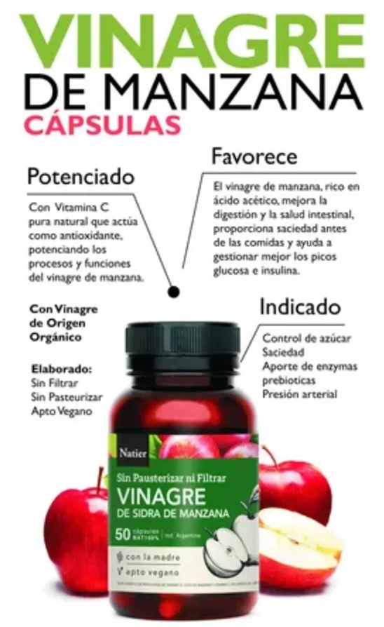 El vinagre de sidra de manzana en cápsulas mejora la sensibilidad a la insulina y reduce los niveles de azúcar en sangre, lo que ayuda a controlar la diabetes tipo 2. Además, aumenta la sensación de saciedad y promueve la pérdida de peso al reducir el consumo de calorías y los niveles de insulina. También contribuye a la salud cardiovascular al disminuir el colesterol, los triglicéridos y la presión arterial. Mejora la salud de la piel gracias a sus propiedades antibacterianas y su capacidad para reequilibrar el pH natural. Combate bacterias dañinas y es útil para desinfectar y tratar diversas infecciones cutáneas. Es importante destacar que la pérdida de peso a largo plazo se logra adoptando hábitos alimenticios y de estilo de vida saludables.